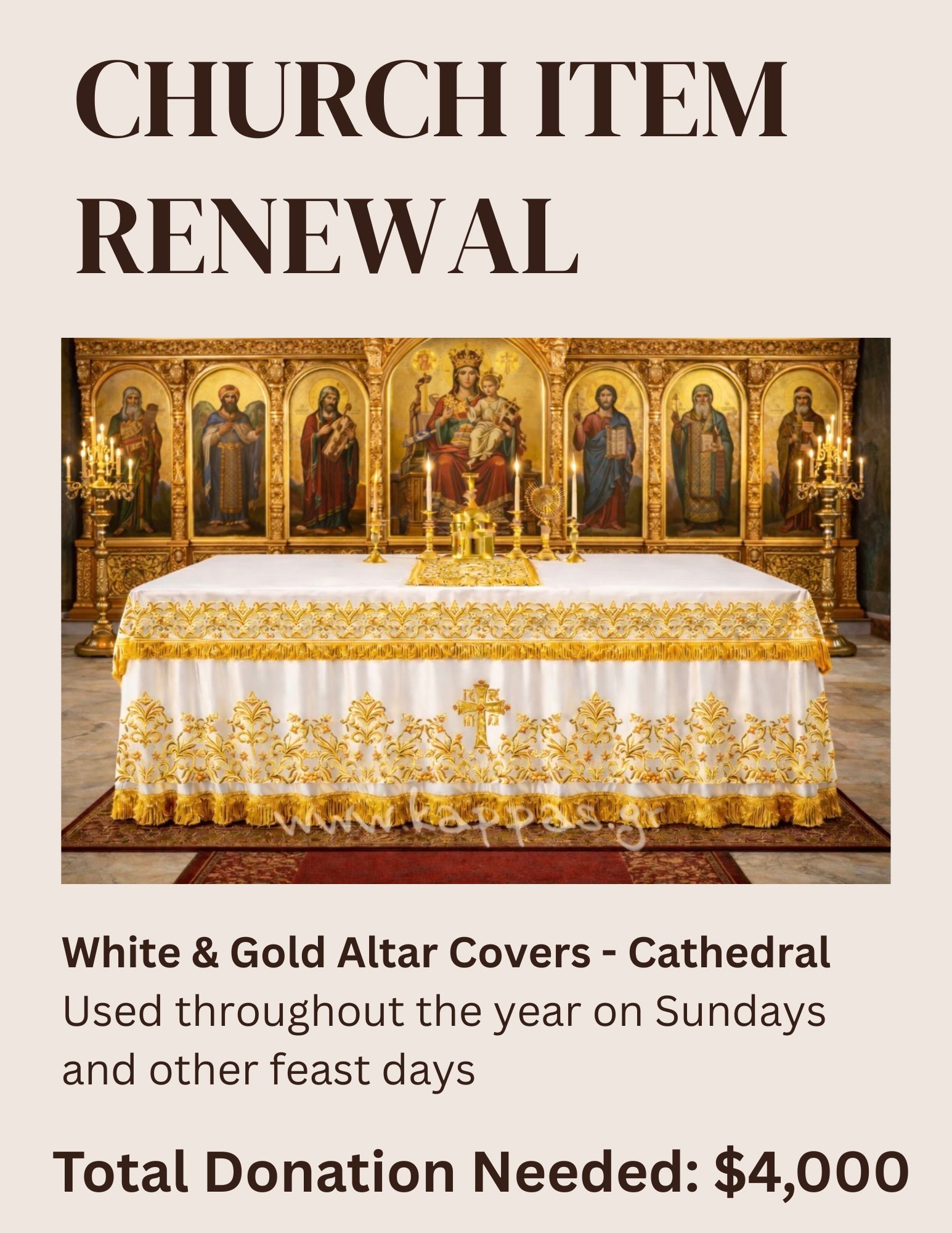 The Cathedral is renewing its liturgical items and needs your help! Contact Fr. Dimitri at (219)769-2481 and frdimitri@ssconstantineandhelen.org or follow the links to donate online today.